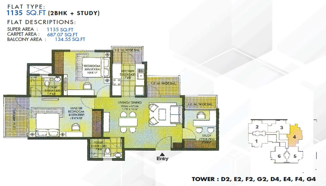 | 2 BHK + 2T + Study | 1135 Sq. Ft. | On Request |